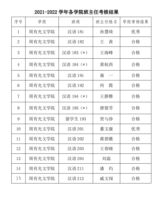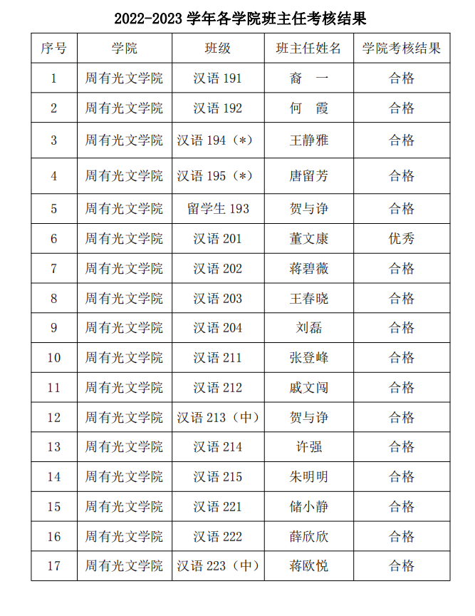 根据《关于开展2021-2022学年、2022-2023学年本科生班主任考核工作的通知》和《常州大学本科生班主任队伍建设管理办法(试行)》,经教师个人申请,在班级工作成效、班主任工作投入度等指标基础上,经学院审核,现将考核结果公示。