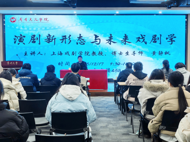 12月17日,富豪娱乐城app下载 在立言楼458成功举办“苔岑雅集·周有光文化大讲堂”第五十四期。上海戏剧学院戏剧文学系教授、博士生导师黄静枫教授,应邀为师生作了题为“演剧新形态与未来戏剧学”的专题讲座。院长葛金华、副院长陈鸿、中文系主任贺与诤出席讲座,近百位师生参加讲座。葛金华院长主持讲座。