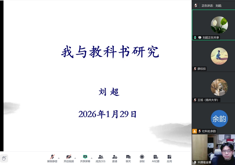 讲座中,刘超教授首先作了题为“我与教科书研究”的分享。他结合其所承担与教科书相关的三项国家社科基金项目畅谈了研究心得与感悟,鼓励大家认真研究、自信为学。王旭副教授以“国家社科后期资助项目申报与结项的全流程经验分享”为题,系统分享了其国家社科基金后期资助项目申报、研究、结项、出版的经验。希望大家兼收并蓄、持续精进。王刚老师则以“高水平人文学科研究的道与术”为题进行了分享。他着重从选题论证、问题提炼和申报研究三个方面进行了交流,并希望大家多向名家学习,不断自我提升,找对真问题、做好真问题。